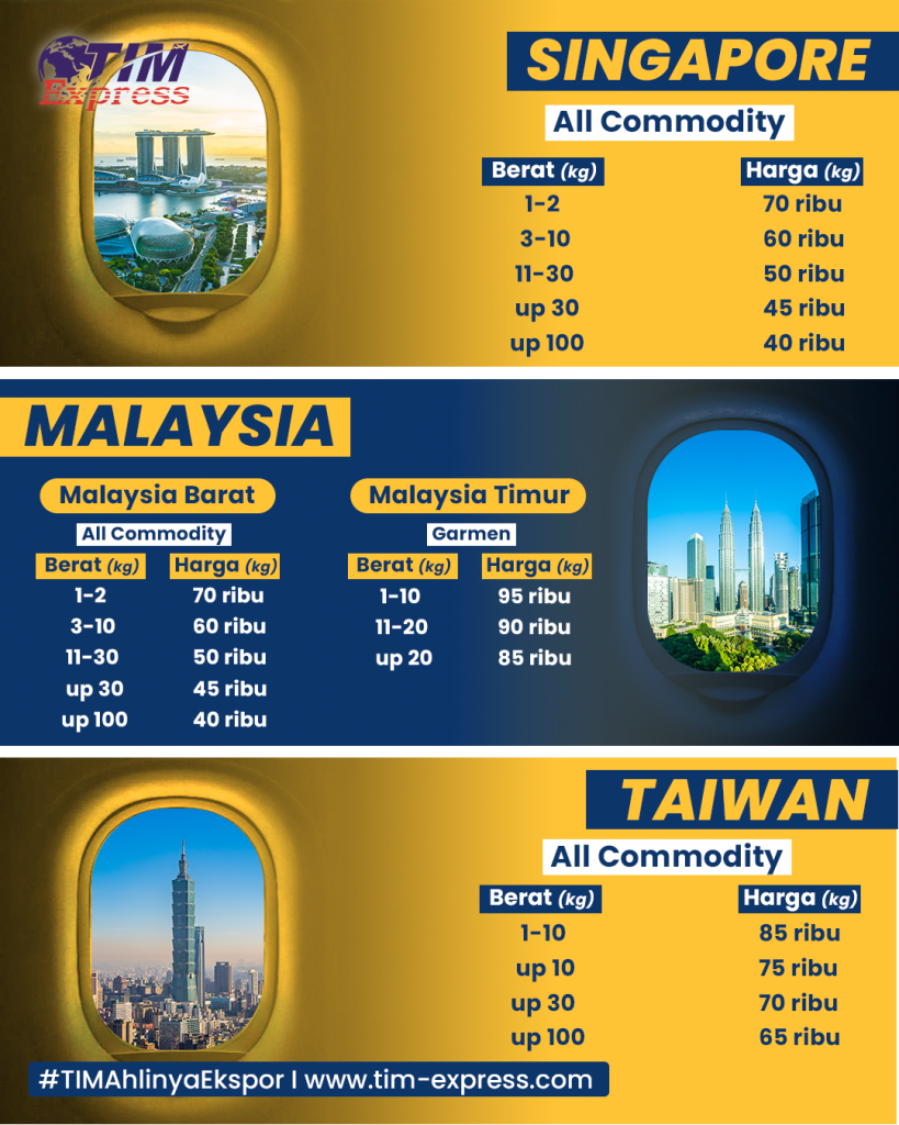 TIM Express melayani jasa pengiriman barang ke Taiwan (door to door service) dengan harga terjangkau dimulai dari Rp.85.000 per-kilogram untuk Semua Komoditas ( Seperti baju, tas, paket umum lainnya, makanan, kosmetik dan herbal).
